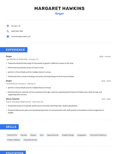 Build a professional singer resume in minutes. Browse through our resume examples to identify the best way to word your resume. Then choose from 5+ resume templates to create your singer resume.