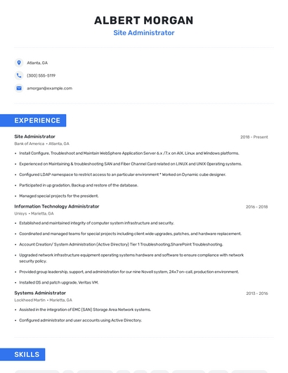 Build a professional site administrator resume in minutes. Browse through our resume examples to identify the best way to word your resume. Then choose from 5+ resume templates to create your site administrator resume.