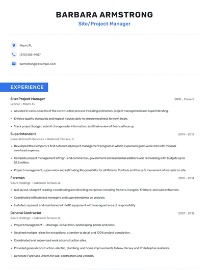 Build a professional site/project manager resume in minutes. Browse through our resume examples to identify the best way to word your resume. Then choose from 5+ resume templates to create your site/project manager resume.