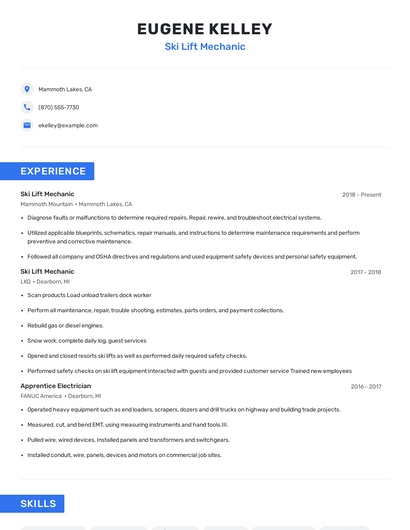 Build a professional ski lift mechanic resume in minutes. Our AI resume writing assistant will guide you through every step of the process, and you can choose from 10+ resume templates to create your ski lift mechanic resume.What skills help Ski Lift Mechanics find jobs?