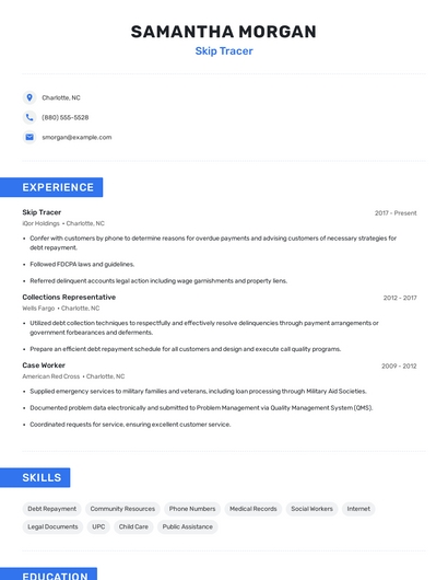 Build a professional skip tracer resume in minutes. Browse through our resume examples to identify the best way to word your resume. Then choose from 5+ resume templates to create your skip tracer resume.