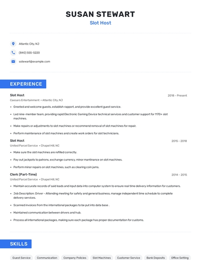 Build a professional slot host resume in minutes. Our AI resume writing assistant will guide you through every step of the process, and you can choose from 10+ resume templates to create your slot host resume.7. VIP