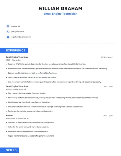 Build a professional small engine technician resume in minutes. Browse through our resume examples to identify the best way to word your resume. Then choose from 5+ resume templates to create your small engine technician resume.