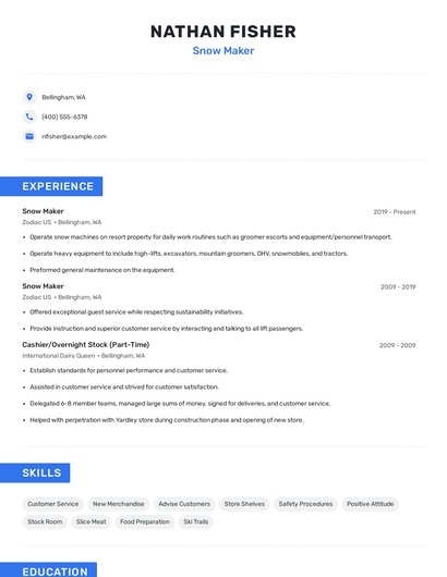 Build a professional snow maker resume in minutes. Our AI resume writing assistant will guide you through every step of the process, and you can choose from 10+ resume templates to create your snow maker resume.7. Trail Maintenance