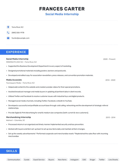 Build a professional social media internship resume in minutes. Browse through our resume examples to identify the best way to word your resume. Then choose from 5+ resume templates to create your social media internship resume.