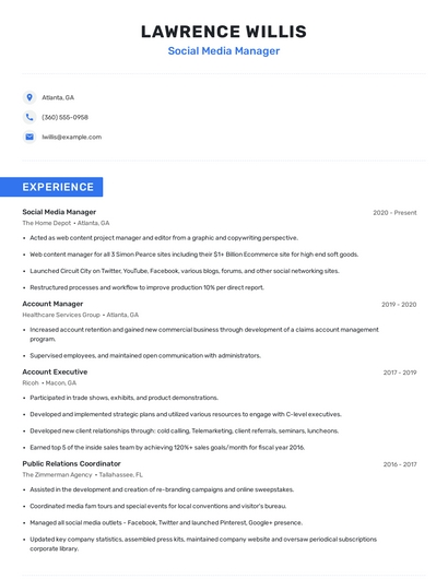 Build a professional social media manager resume in minutes. Browse through our resume examples to identify the best way to word your resume. Then choose from 5+ resume templates to create your social media manager resume.