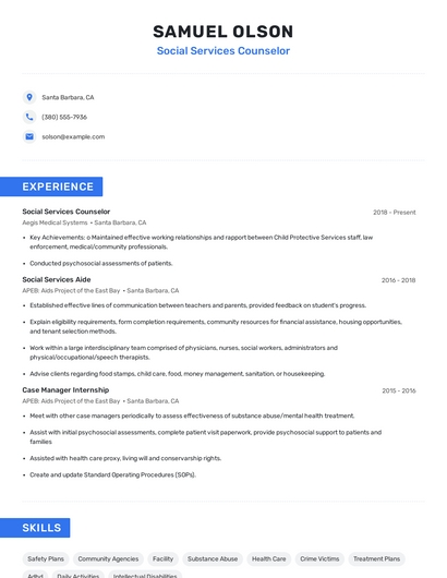 Build a professional social services counselor resume in minutes. Browse through our resume examples to identify the best way to word your resume. Then choose from 5+ resume templates to create your social services counselor resume.