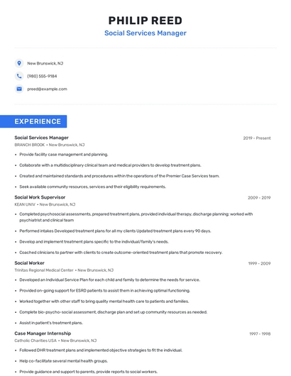Build a professional social services manager resume in minutes. Browse through our resume examples to identify the best way to word your resume. Then choose from 5+ resume templates to create your social services manager resume.