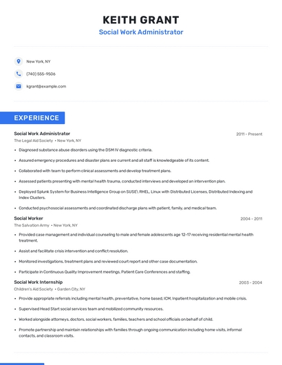 Build a professional social work administrator resume in minutes. Browse through our resume examples to identify the best way to word your resume. Then choose from 5+ resume templates to create your social work administrator resume.