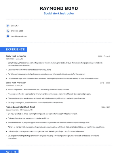 Build a professional social work instructor resume in minutes. Browse through our resume examples to identify the best way to word your resume. Then choose from 5+ resume templates to create your social work instructor resume.
