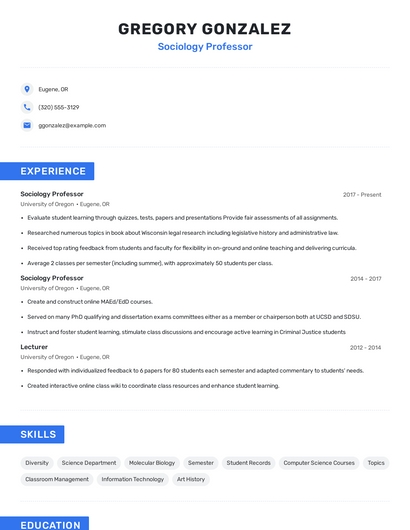 Build a professional sociology professor resume in minutes. Our AI resume writing assistant will guide you through every step of the process, and you can choose from 10+ resume templates to create your sociology professor resume.What skills help Sociology Professors find jobs?