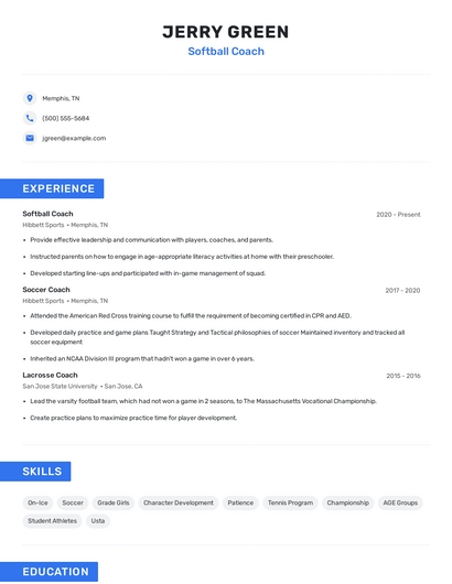Build a professional softball coach resume in minutes. Browse through our resume examples to identify the best way to word your resume. Then choose from 5+ resume templates to create your softball coach resume.