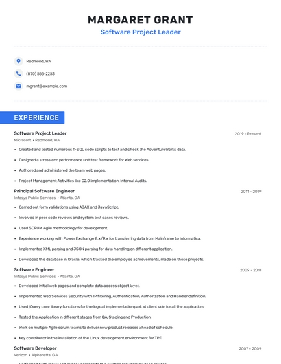 Build a professional software project leader resume in minutes. Browse through our resume examples to identify the best way to word your resume. Then choose from 5+ resume templates to create your software project leader resume.