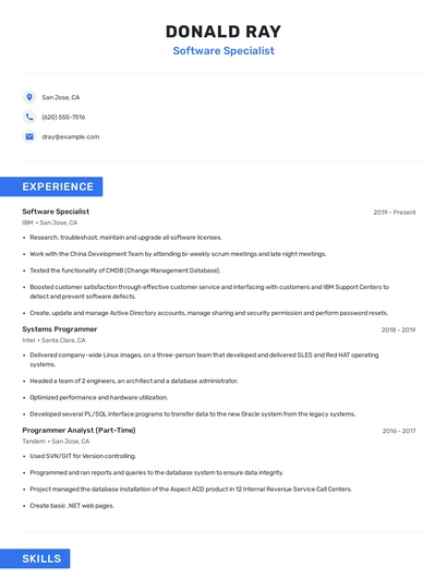Build a professional software specialist resume in minutes. Browse through our resume examples to identify the best way to word your resume. Then choose from 5+ resume templates to create your software specialist resume.