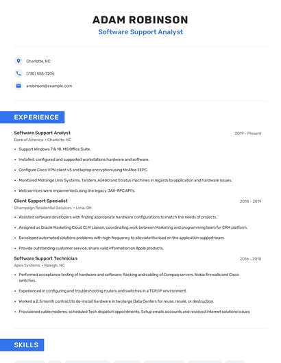 Build a professional software support analyst resume in minutes. Browse through our resume examples to identify the best way to word your resume. Then choose from 5+ resume templates to create your software support analyst resume.