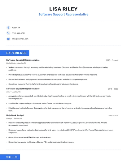 Build a professional software support representative resume in minutes. Browse through our resume examples to identify the best way to word your resume. Then choose from 5+ resume templates to create your software support representative resume.