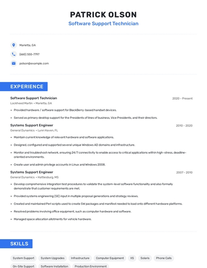 Build a professional software support technician resume in minutes. Browse through our resume examples to identify the best way to word your resume. Then choose from 5+ resume templates to create your software support technician resume.