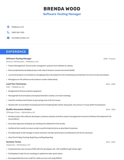 Build a professional software testing manager resume in minutes. Browse through our resume examples to identify the best way to word your resume. Then choose from 5+ resume templates to create your software testing manager resume.