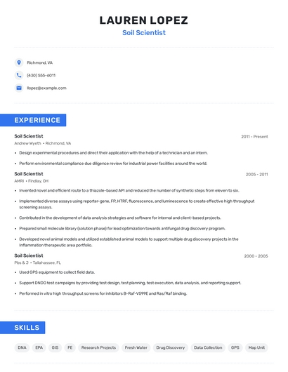 Build a professional soil scientist resume in minutes. Browse through our resume examples to identify the best way to word your resume. Then choose from 5+ resume templates to create your soil scientist resume.