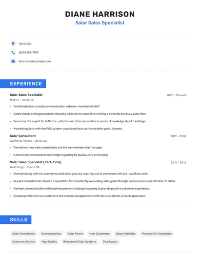 Build a professional solar sales specialist resume in minutes. Browse through our resume examples to identify the best way to word your resume. Then choose from 5+ resume templates to create your solar sales specialist resume.