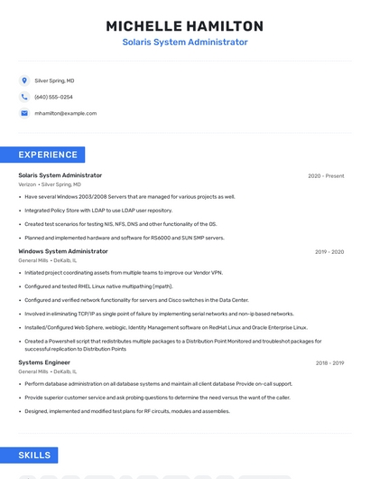 Build a professional solaris system administrator resume in minutes. Browse through our resume examples to identify the best way to word your resume. Then choose from 5+ resume templates to create your solaris system administrator resume.