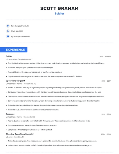 Build a professional soldier resume in minutes. Browse through our resume examples to identify the best way to word your resume. Then choose from 5+ resume templates to create your soldier resume.