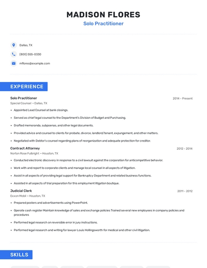 Build a professional solo practitioner resume in minutes. Browse through our resume examples to identify the best way to word your resume. Then choose from 5+ resume templates to create your solo practitioner resume.