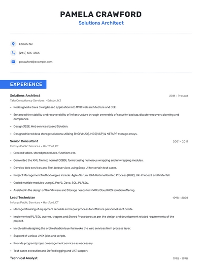 Build a professional solutions architect resume in minutes. Browse through our resume examples to identify the best way to word your resume. Then choose from 5+ resume templates to create your solutions architect resume.