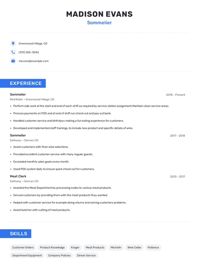 Build a professional sommelier resume in minutes. Browse through our resume examples to identify the best way to word your resume. Then choose from 5+ resume templates to create your sommelier resume.