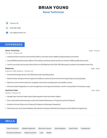 Build a professional sonar technician resume in minutes. Browse through our resume examples to identify the best way to word your resume. Then choose from 5+ resume templates to create your sonar technician resume.