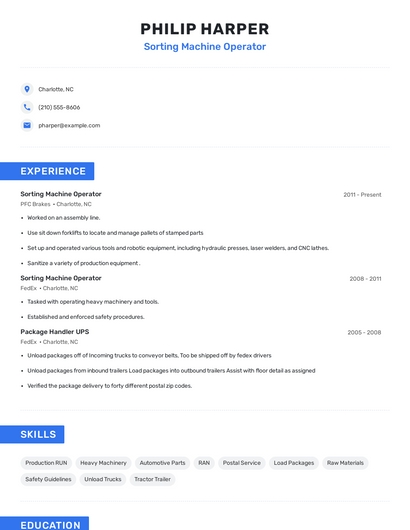Build a professional sorting machine operator resume in minutes. Our AI resume writing assistant will guide you through every step of the process, and you can choose from 10+ resume templates to create your sorting machine operator resume.7. Sortation