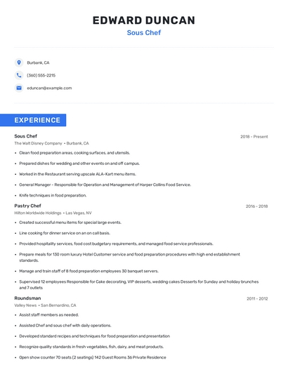 Build a professional sous chef resume in minutes. Browse through our resume examples to identify the best way to word your resume. Then choose from 5+ resume templates to create your sous chef resume.