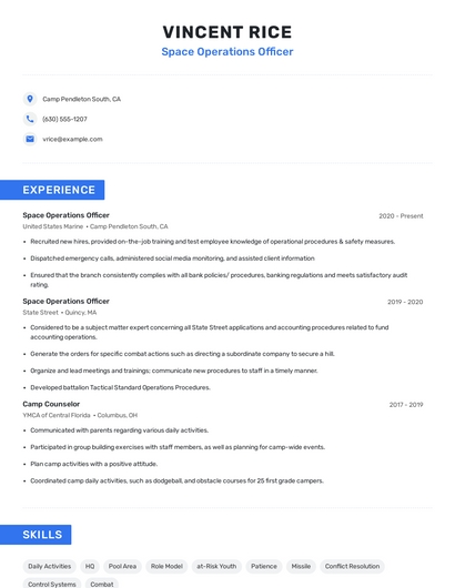 The most important skills for a space operations officer resume and required skills for a space operations officer to have include: