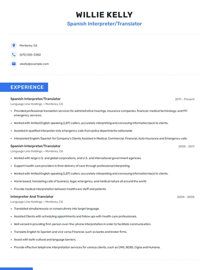 Build a professional spanish interpreter/translator resume in minutes. Browse through our resume examples to identify the best way to word your resume. Then choose from 5+ resume templates to create your spanish interpreter/translator resume.