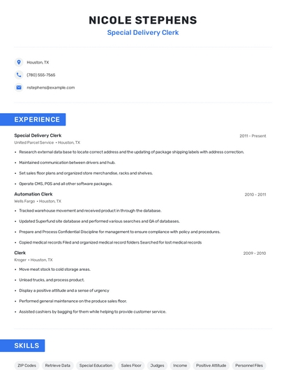 Choose from 10+ customizable special delivery clerk resume templates