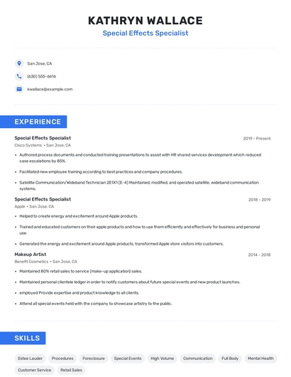 Build a professional special effects specialist resume in minutes. Our AI resume writing assistant will guide you through every step of the process, and you can choose from 10+ resume templates to create your special effects specialist resume.7. Foreclosure