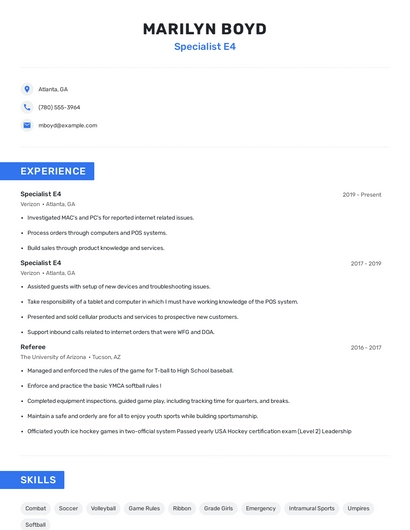 Build a professional specialist e4 resume in minutes. Browse through our resume examples to identify the best way to word your resume. Then choose from 5+ resume templates to create your specialist e4 resume.