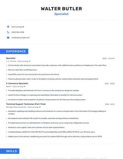 Build a professional specialist resume in minutes. Browse through our resume examples to identify the best way to word your resume. Then choose from 5+ resume templates to create your specialist resume.