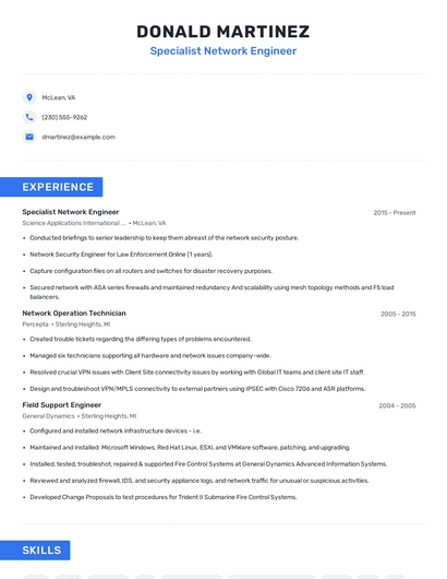 Build a professional specialist network engineer resume in minutes. Browse through our resume examples to identify the best way to word your resume. Then choose from 5+ resume templates to create your specialist network engineer resume.
