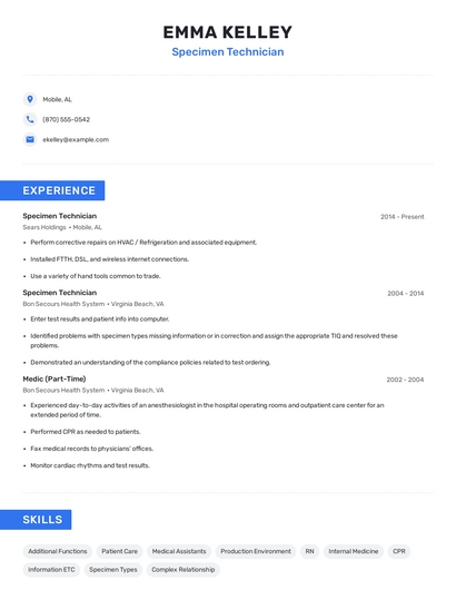 Build a professional specimen technician resume in minutes. Browse through our resume examples to identify the best way to word your resume. Then choose from 5+ resume templates to create your specimen technician resume.