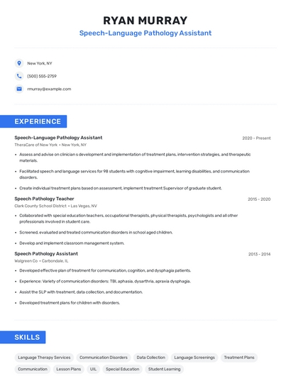 Build a professional speech-language pathology assistant resume in minutes. Browse through our resume examples to identify the best way to word your resume. Then choose from 5+ resume templates to create your speech-language pathology assistant resume.