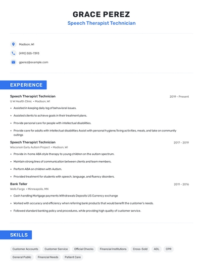 Build a professional speech therapist technician resume in minutes. Browse through our resume examples to identify the best way to word your resume. Then choose from 5+ resume templates to create your speech therapist technician resume.