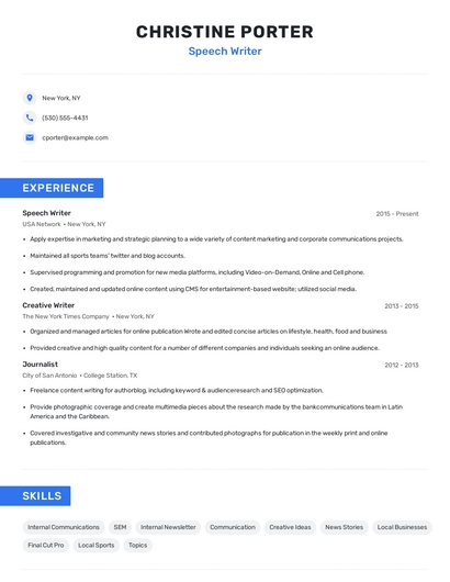 Build a professional speech writer resume in minutes. Browse through our resume examples to identify the best way to word your resume. Then choose from 5+ resume templates to create your speech writer resume.