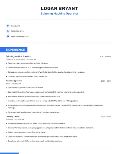 Build a professional spinning machine operator resume in minutes. Our AI resume writing assistant will guide you through every step of the process, and you can choose from 10+ resume templates to create your spinning machine operator resume.What skills help Spinning Machine Operators find jobs?