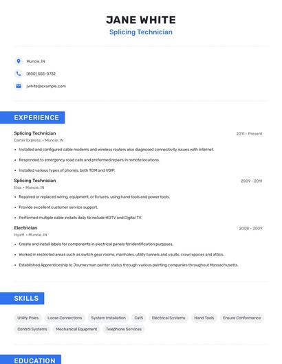 Build a professional splicing technician resume in minutes. Browse through our resume examples to identify the best way to word your resume. Then choose from 5+ resume templates to create your splicing technician resume.
