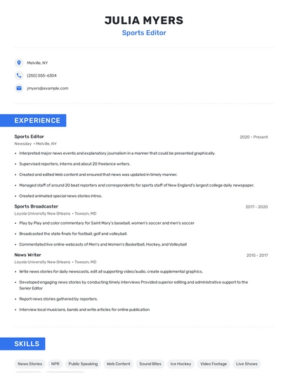 Build a professional sports editor resume in minutes. Browse through our resume examples to identify the best way to word your resume. Then choose from 5+ resume templates to create your sports editor resume.