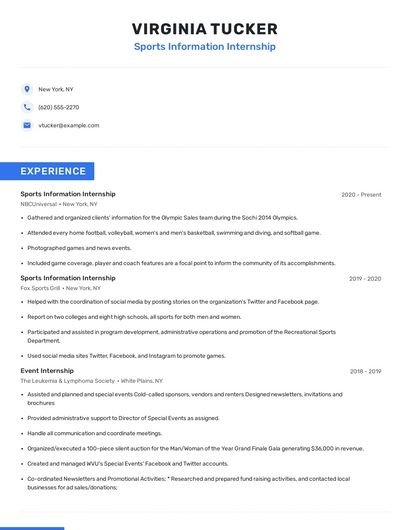 Build a professional sports information internship resume in minutes. Browse through our resume examples to identify the best way to word your resume. Then choose from 5+ resume templates to create your sports information internship resume.