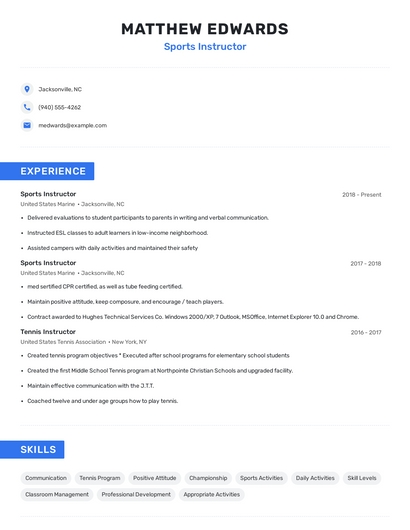 Build a professional sports instructor resume in minutes. Browse through our resume examples to identify the best way to word your resume. Then choose from 5+ resume templates to create your sports instructor resume.