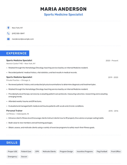 Build a professional sports medicine specialist resume in minutes. Browse through our resume examples to identify the best way to word your resume. Then choose from 5+ resume templates to create your sports medicine specialist resume.