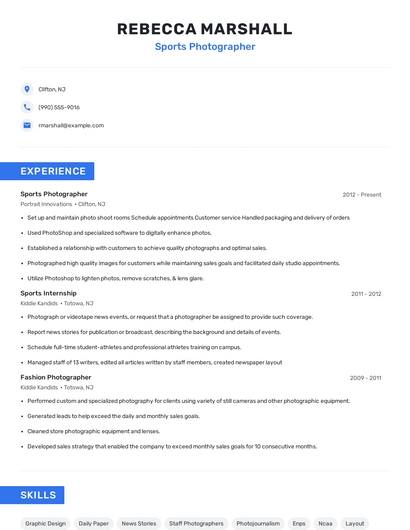 Build a professional sports photographer resume in minutes. Browse through our resume examples to identify the best way to word your resume. Then choose from 5+ resume templates to create your sports photographer resume.